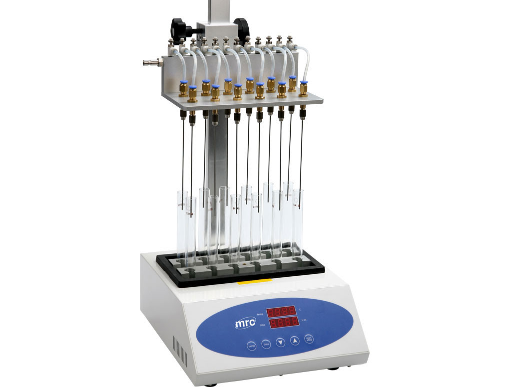 MRC Sample Concentrator (AKA Gas Concentrator, Nitrogen Concentrator) - a sturdy instrument complete with digital controller, sample heating block, base, stand assembly, and gas distribution system. Designed for the rapid evaporation of laboratory solvents by blowing gas onto the surface of the solution with inserted needles or gas pipettes.